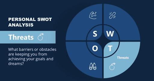 Think about outside circumstances that disfavour you when developing your list of threats. Consider yourself a business or a product, and compare yourself to others. It makes it simpler for you to recognize hazards in this way. Just consider the following question at this phase: What are the barriers—personal or otherwise—that stand in the way of your goals-setting objectives? Threats can also come from competitors, new industry regulations, or adjustments to the work market (such as unemployment or even a pandemic). Determine the threats and make an effort to remove those you can. Negative personality qualities are among the easiest to change when it comes to eliminating risk. Knowing about potential risks might help you create measures to reduce the risk or seize the opportunity.