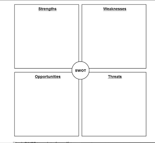 In SWOT, the “stand out from the rest” component is crucial. For instance, in a software business, everyone has a degree in software engineering, therefore having one is not a strength. A distinct situation might arise for maths masters. Be generous and fill out as many strengths as you can think of.